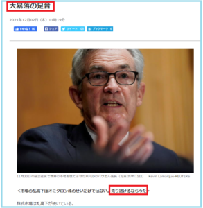 オミクロン株の影響とパウエル議長の早期利上げ発言で、米国株式も大幅に売られてます。