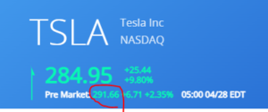 本日のプレでのテスラの株価が291ドルになってますね。